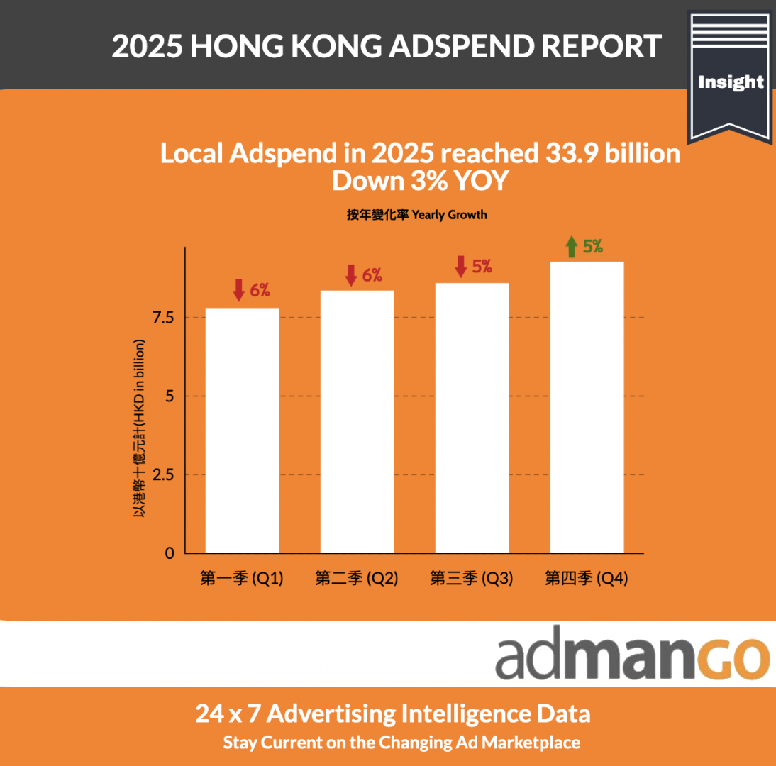 According to admanGo, total adspend in Hong Kong reached HK$33.9 billion in 2025, representing a 3% YOY decline for the full year. The advertising market followed a “decline-then-stabilisation” trajectory, with YOY decreases recorded in the first three quarters, before a clear rebound in the fourth quarter, which posted 5% YOY growth, indicating a gradual recovery toward year-end. Although local business activity in early 2025 had not yet been directly affected by the tangible impact of US tariffs, the continued trend of Hong Kong residents travelling northbound and overseas led to structural changes in local consumption, prompting advertisers to adopt a more cautious approach to resource allocation. Nevertheless, positive factors—including the government’s promotion of mega events and bank interest rate cuts in the second half of the year helped offset part of the uncertainty brought about by tariffs and a high interest rate environment, providing overall support to consumer sentiment. As a result, adspend across several key sectors, such as Banking, Pharmaceuticals, Travel and Toiletries recorded YOY growth, signalling a gradual recovery in market confidence.