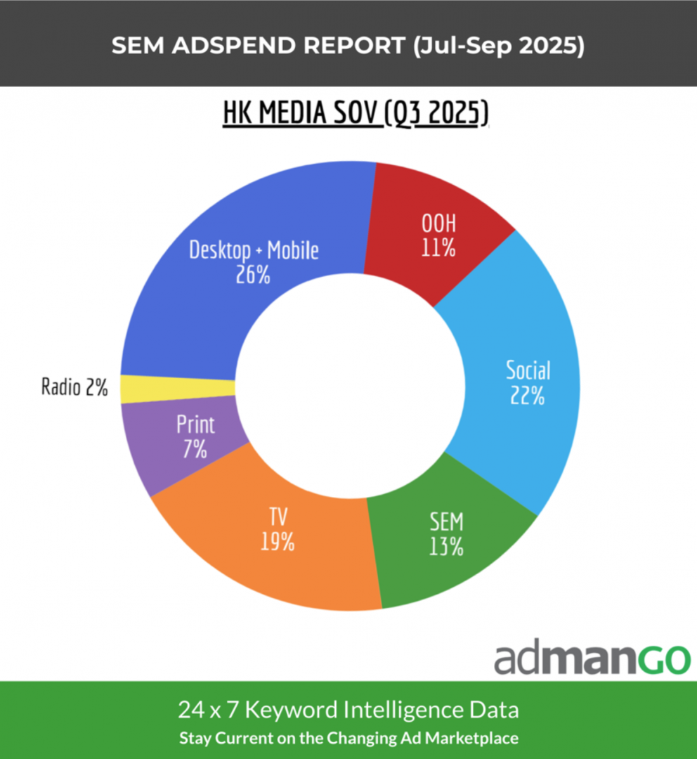 2025年第三季,SEM廣告支出佔所有媒體使用量約13%,僅次於桌面與流動廣告、社交媒體及電視,位列第四。平均每月SEM廣告支出超過3億港元。SEM廣告支出排名前五名的行業包括旅遊、銀行、電腦、商業服務和保險,當中,旅遊業的廣告客戶投放超過3成廣告開支在SEM。