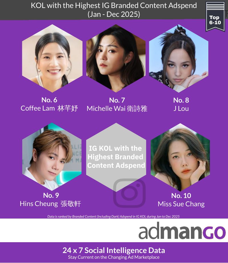 根據admanGo數據顯示,以2025年品牌內容廣告總銷售額計算,十大IG KOL排名第六至十位依次序為林芊妤、 衛詩雅、J Lou、張敬軒 及Miss Sue Chang。