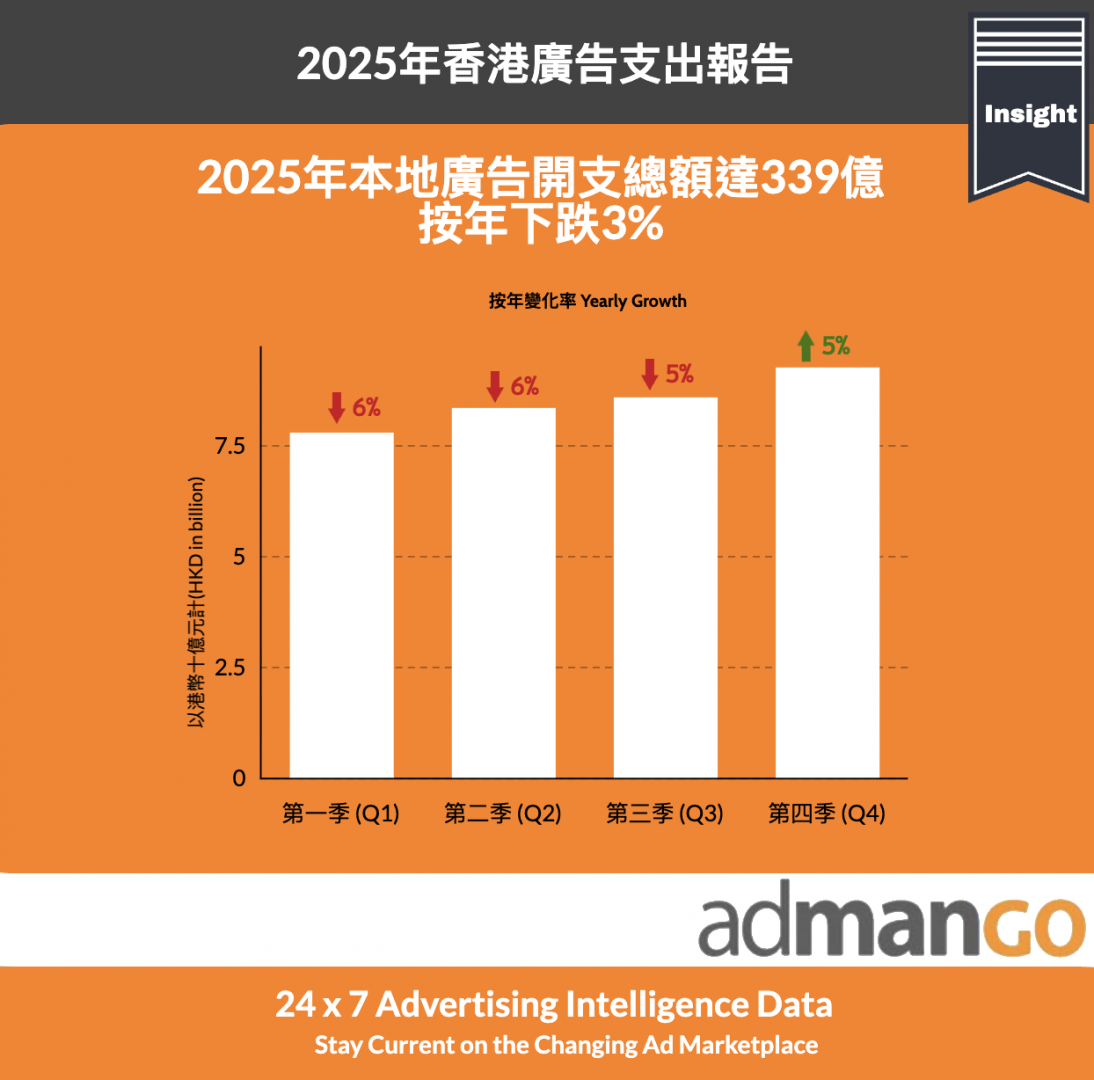 根據 admanGo 廣告數據,2025 年香港廣告開支總額錄得339億港元,全年錄得3%按年下跌。廣告市場年內呈現先跌後穩的走勢,經歴首三季錄得度按年下跌後,第四季明顯回穩並錄得 5% 按年增長,反映廣告市場於年底逐步復甦。儘管2025年初本地商業活動仍未直接受關到美國關稅實質影響,但港人北上和外遊熱潮持續,令本地消費出現結構改變,促使廣告商在資源配置上更趨向審慎,在多項盛事經濟活動及下半年銀行減息等正面因素帶動下,抵消部份由關稅及高息環境下為本地經濟帶來的不確定性,整體消費氣氛為廣告商帶來正面支持,多個關鍵行業如銀行、醫藥、旅遊及家居用品等的廣告開支均錄得按年增長,顯示市場前景的信心正逐步恢復。