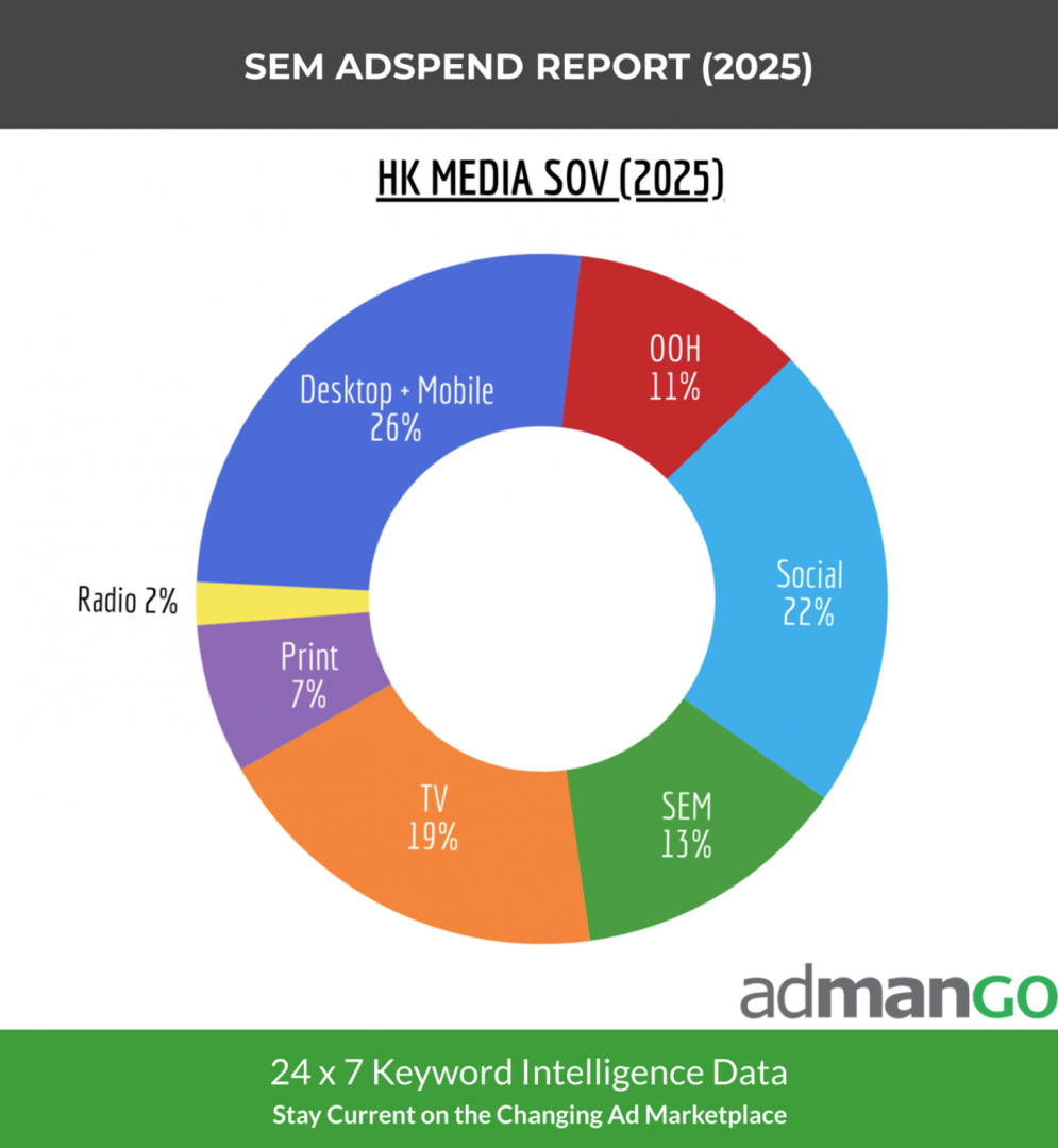 2025年,SEM廣告支出佔所有媒體使用量約13%,僅次於桌面與流動廣告、社交媒體及電視,位列第四。平均每月SEM廣告支出突破3.6億港元。SEM廣告支出排名前五名的行業包括旅遊、銀行、電腦、商業服務和保險,當中,旅遊業的廣告客戶投放超過近4成廣告開支在SEM。